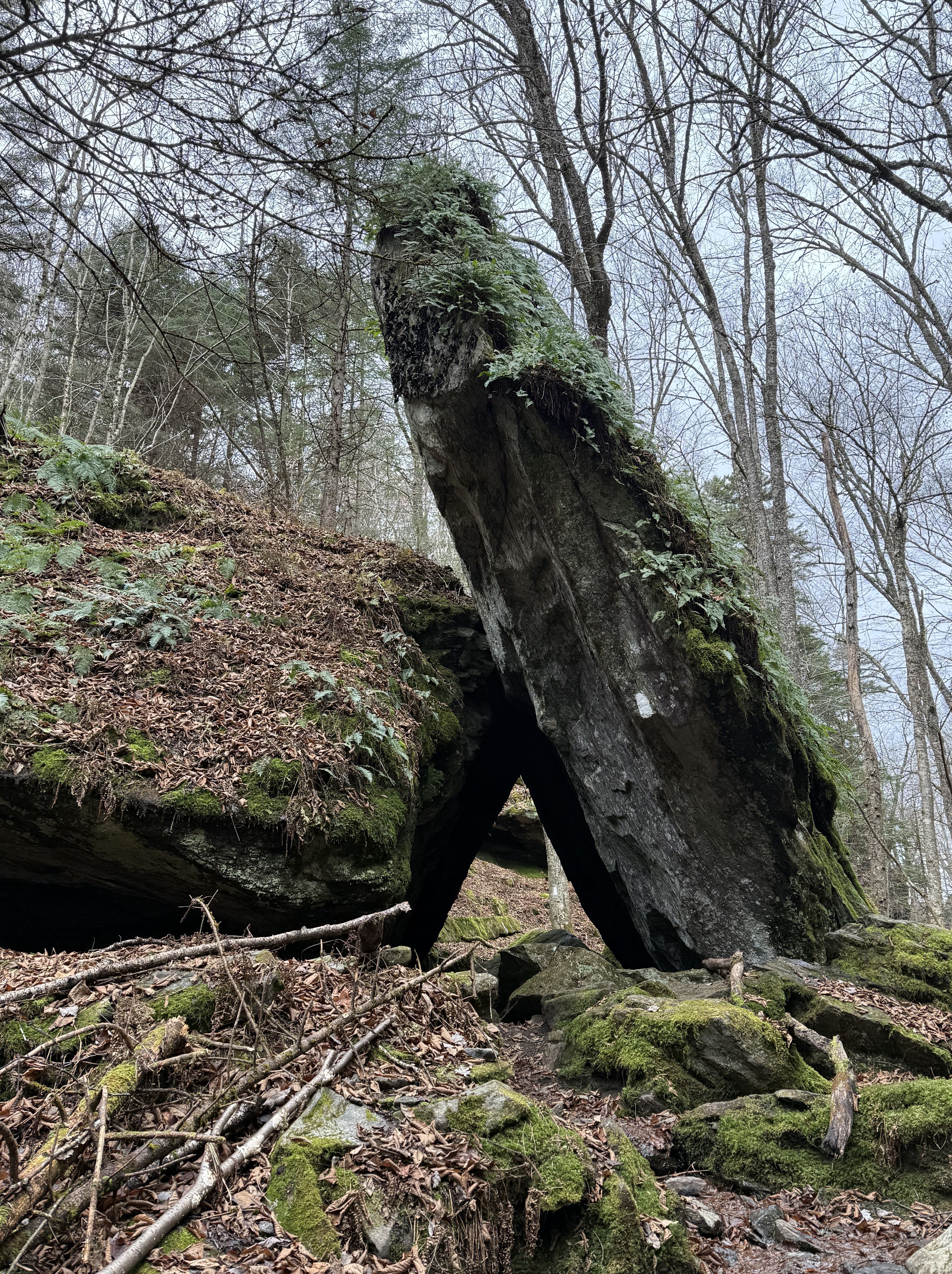 After climbing a wooden ladder into the gulch, an exciting rock scramble and slender passages confront hikers. At the gulch’s center, two huge rocks form a narrow “A-frame,” which hikers must navigate carefully. After a few hundred yards, the trail emerges back into the forest. The Long Trail continues south toward Mount Mansfield, Vermont’s tallest mountain. The forest edge is the turnaround point for most day-trippers who retrace their steps for 0.7 miles to the Babcock Trail junction.