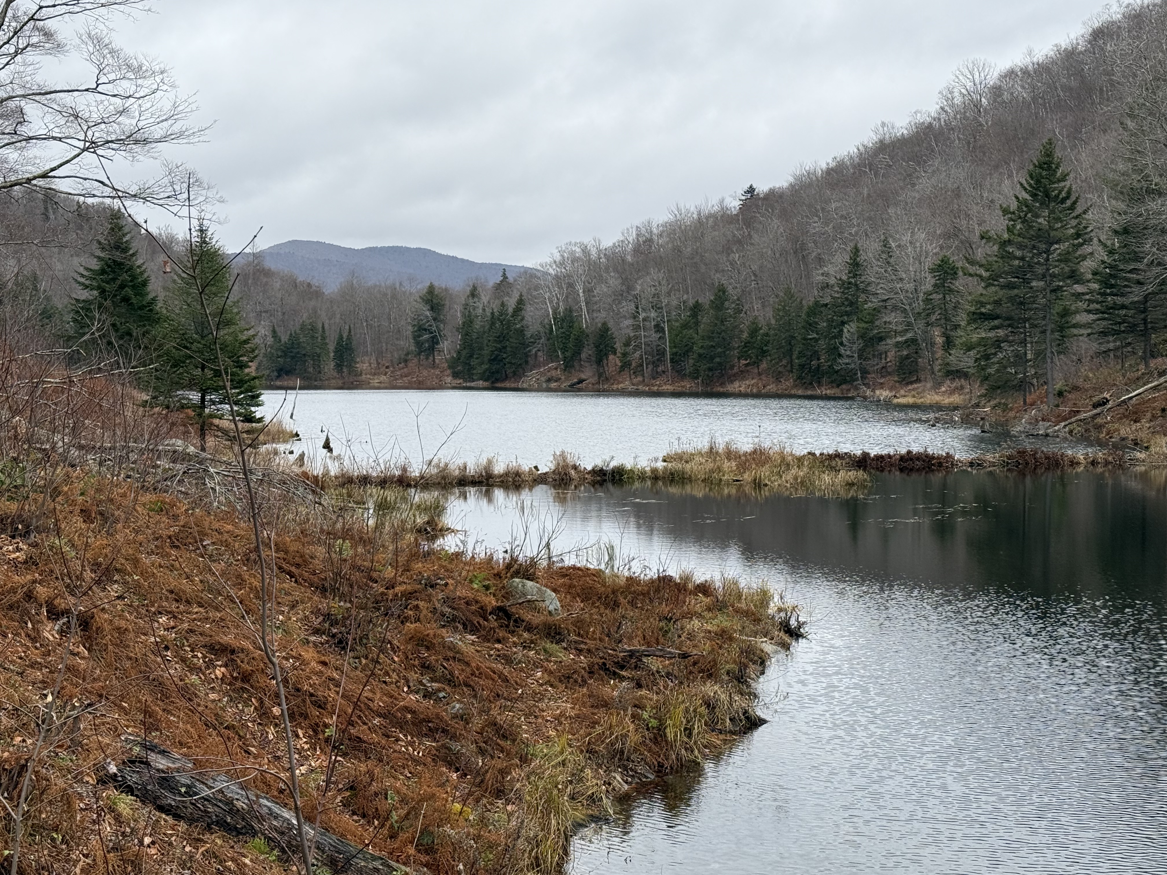 Abruptly, a rocky ledge emerges, presenting a beautiful vista of the placid, undeveloped Ritterbush Lake. From this high perch, trail builders cut the trail straight down the steep hill towards the lake without switchbacks, as is typical of Vermont paths. The trail descends a long stretch of precipitous stone steps remarkably placed many years ago. At the bottom, the trail winds 100 feet above the lake to the southwest, crossing several small streams.