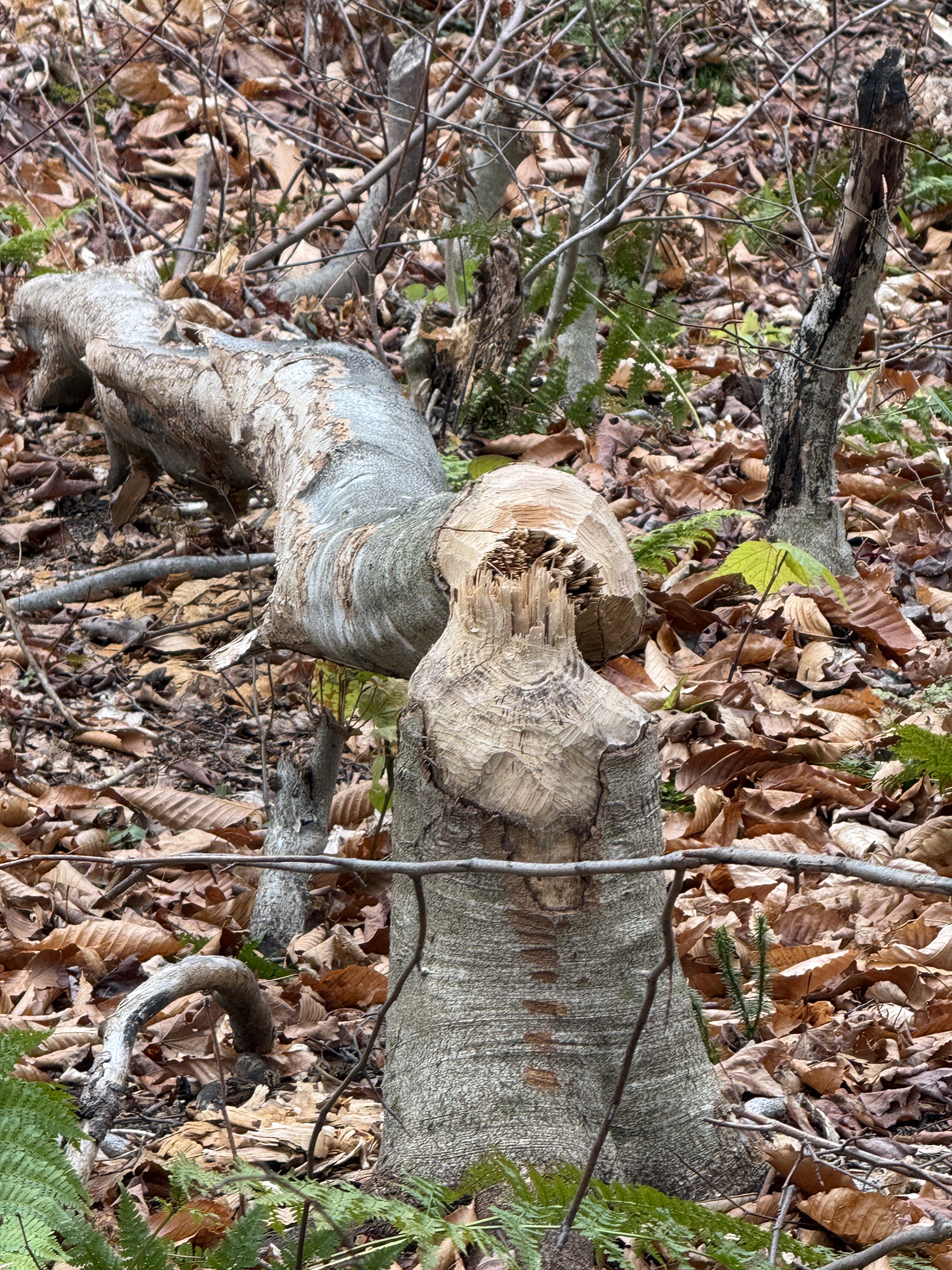 Turning onto the Babcock Trail, hikers heed the blue blazes up a gentle hill to return to their cars. The easy-to-follow trail rises slowly to a ridge. After reaching the heights, hikers encounter many signs of beaver activity at the swampy outlet of Big Muddy Lake.